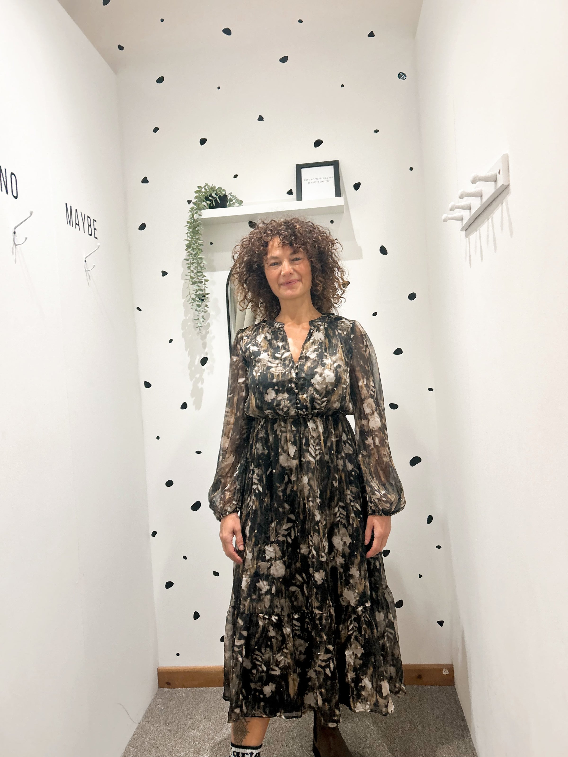Long sleeve tiered dress with gold flecks