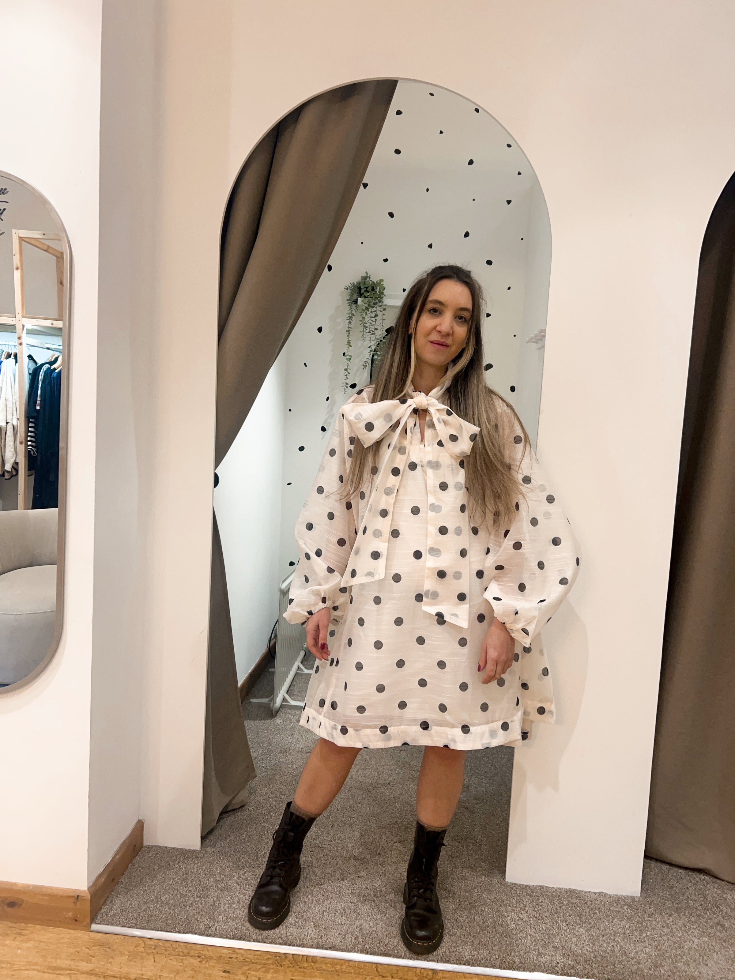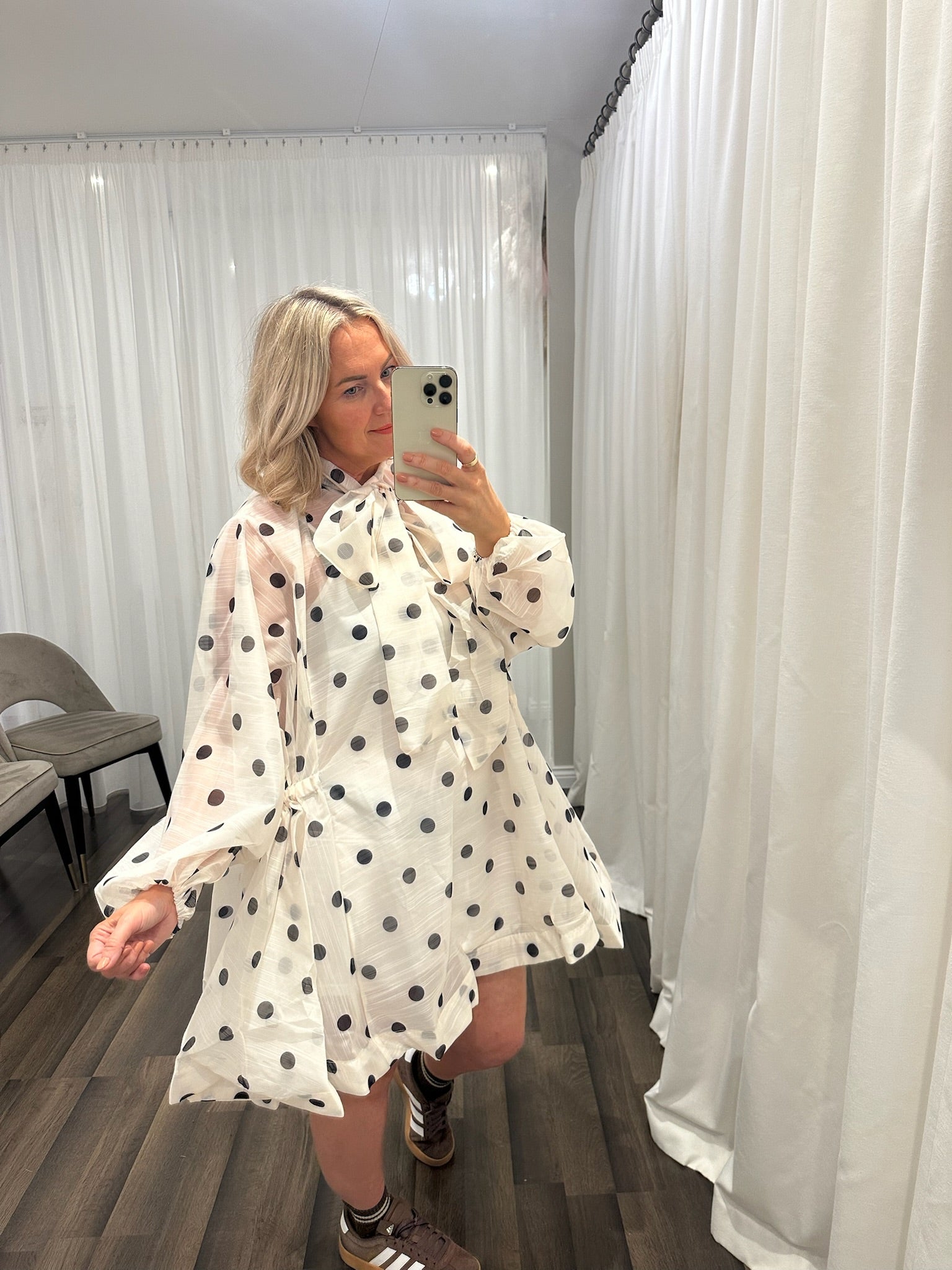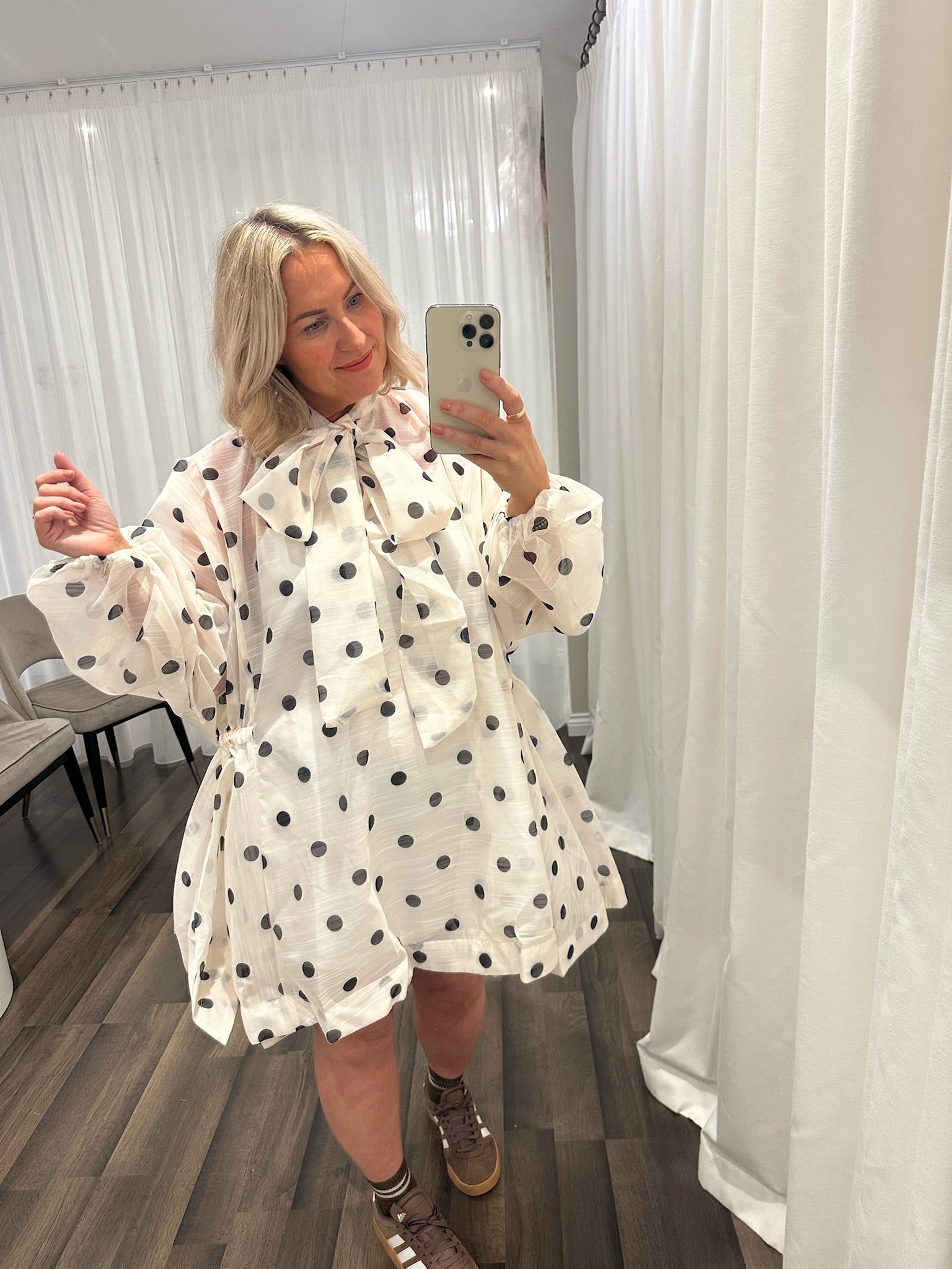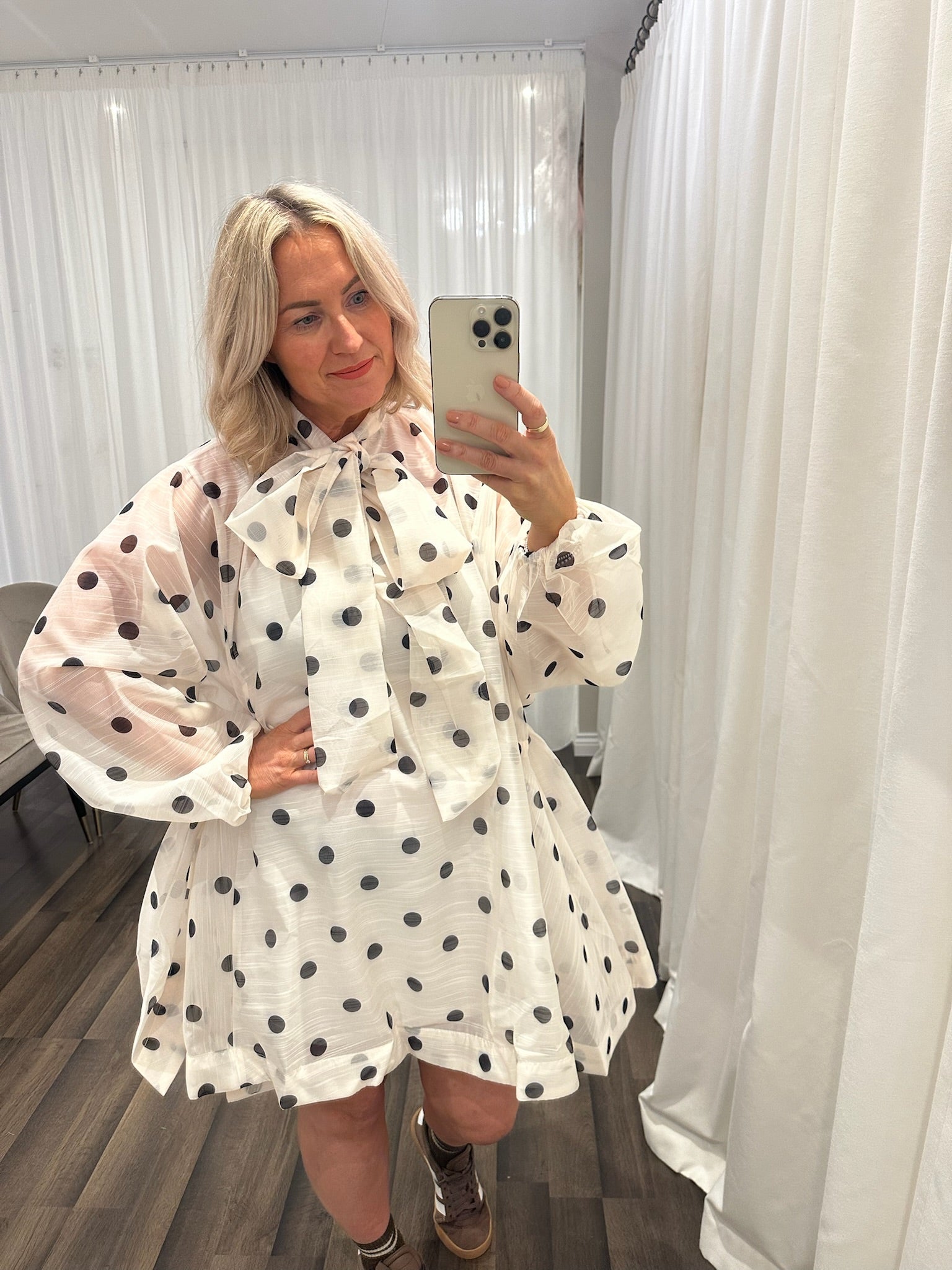 Oversized polka dot print billow dress with ballon sleeves & neck tie detail